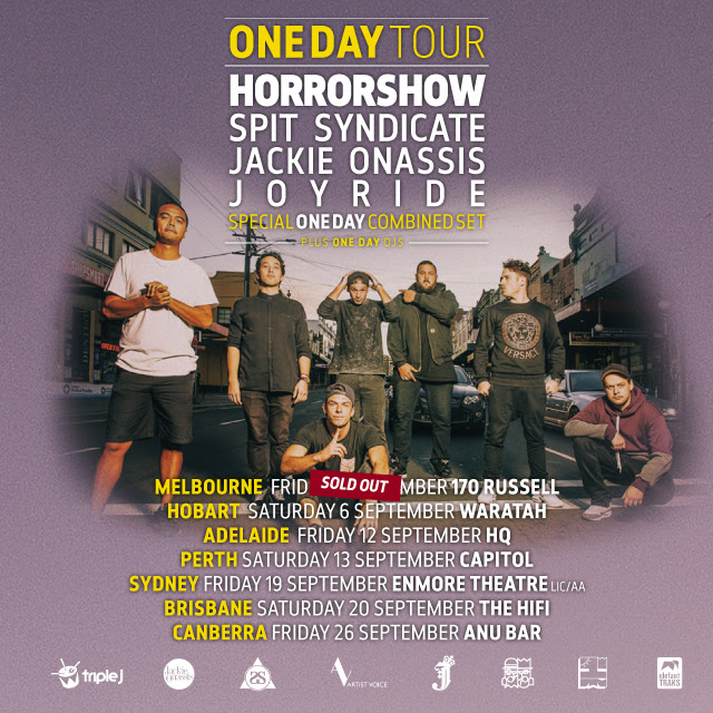 Fresh from their #2 ARIA album chart debut, One Day are already two shows deep into their nation wide tour. Landing in Adelaide this Friday night and then onto Perth for Saturday, the tour will see the crew comprising of Horrorshow, Spit Syndicate, Jackie Onassis and Joyride play individual sets culminating with an all-in finale.
