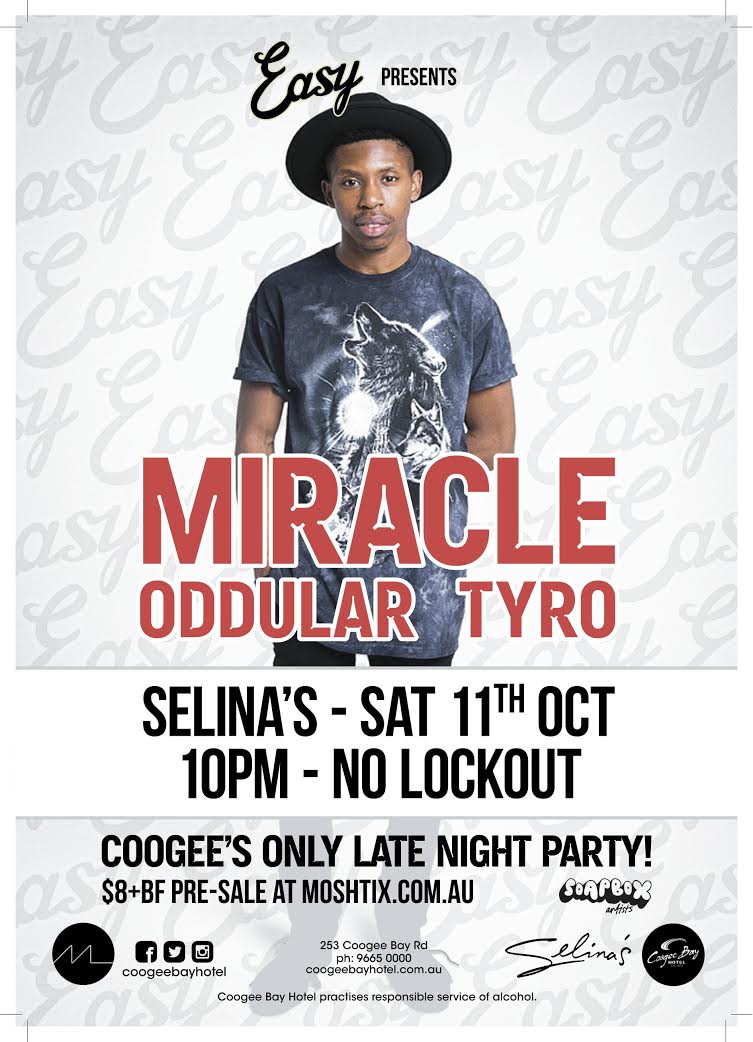 Proving to be the heart of Coogee’s now bubbling live music hub, EASY Saturdays at Selina’s announce hip hop’s newest scene-stirrer Miracle will be taking over the dance floor this October 11th following the success of their Spring Break event.