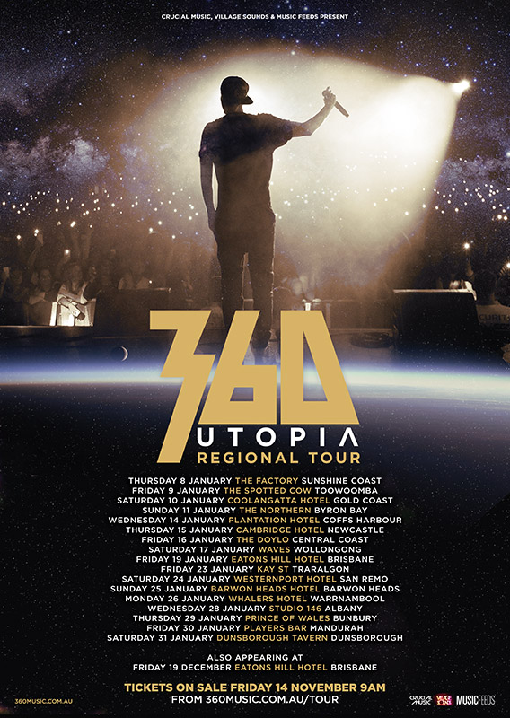Crucial Music and Village Sounds are proud to announce 360, the country’s hottest and most controversial rapper is taking his stellar LP Utopia out to the elements of regional Australia on a 16-date tour across four weeks this January. The Utopia Regional Tour kicks off on Queensland’s Sunshine Coast, heading down the New South Wales coast, in through country and coastal Victoria, before heading across to Western Australia.