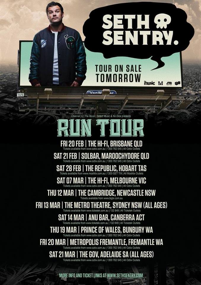 Following the premiere of Run on triple j Breakfast with Matt & Alex, Seth has announced his first national headline tour for 2015. The tour heads to all major capital cities, as well as a handful of Seth’s favourite regional stops. Catch Seth Sentry performing all around Australia this February and March on the Run Tour 2015.