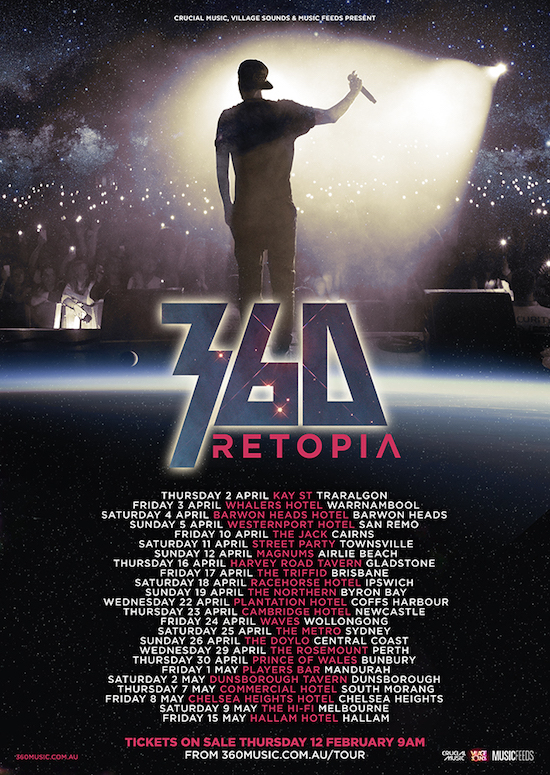 Acclaimed Australian rapper 360 is thrilled to announce new touring dates for the rebranded national Retopia Tour this April and May. Hitting some of the best regional towns in Queensland, New South Wales, Victoria and Western Australia across 6 huge weeks, the re-scheduled dates will see 360’s tour expand from 16 to a whopping 24 dates, including very special intimate shows in capital cities along the way.