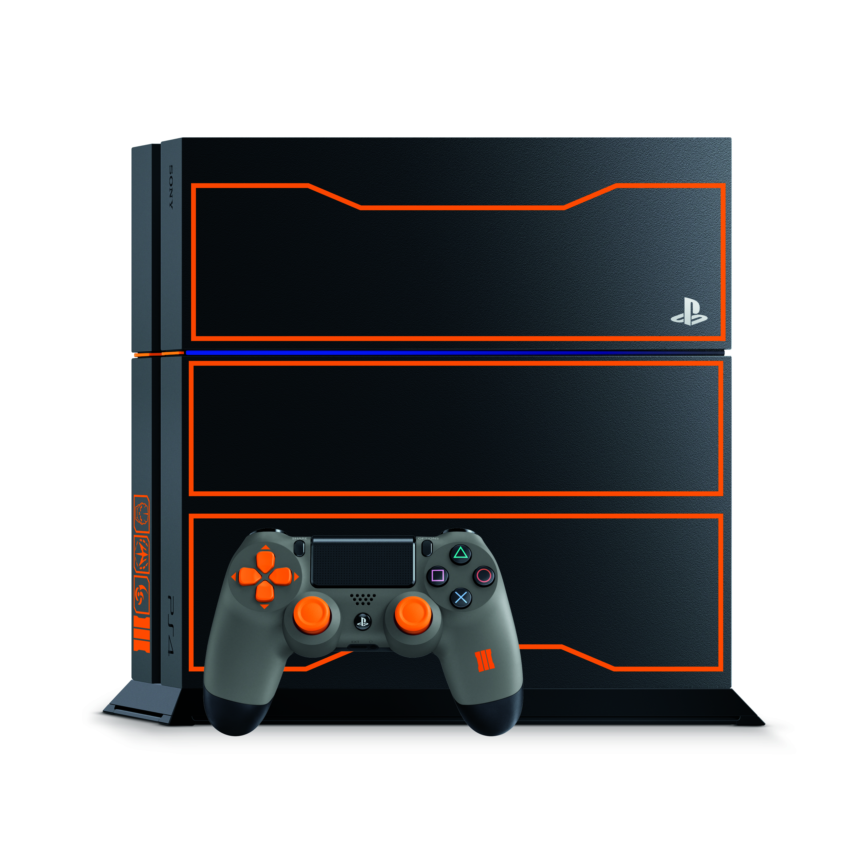 This PS4 features the Call of Duty: Black Ops III ember orange logo on a Jet Black chassis, complete with colored power and eject buttons, as well as three emblems on the front each representing a game mode — the SOG Skull signifies campaign, the Winslow Accord faction logo is pulled straight from the game’s fiction, representing one of the factions you play in multiplayer, and “the mark” denotes zombies.