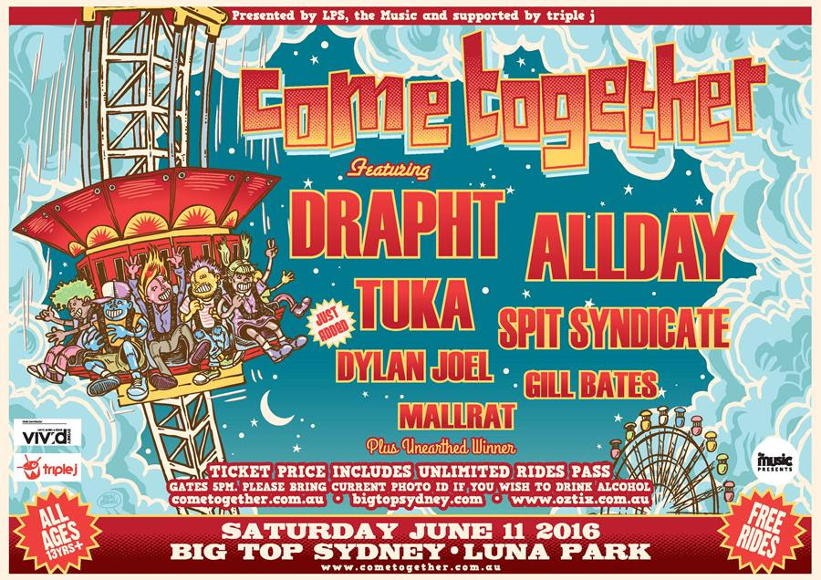 Come Together are pleased to announce the addition of TUKA and Dylan Joel to the already exceptional line up joining Drapht, Allday, Spit Syndicate, Gill Bates and Mallrat.