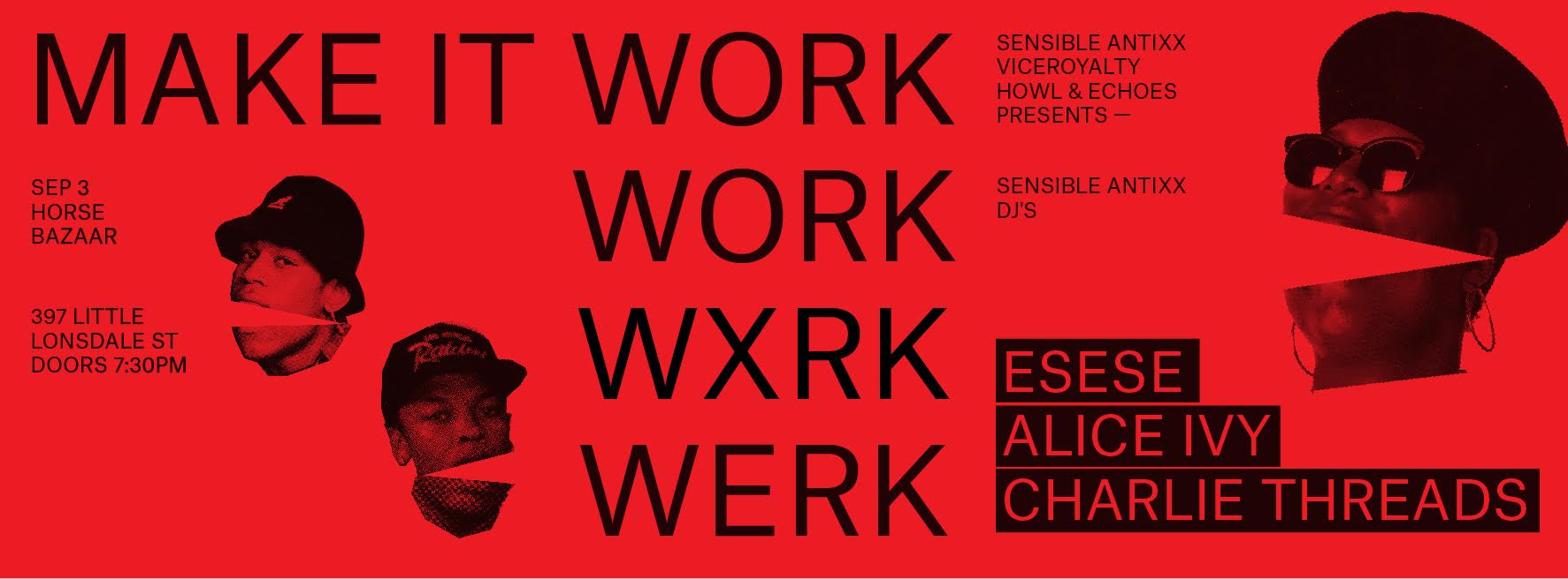 Presented by Sensible Antixx, Viceroyalty and Howl & Echoes, Sensible Antixx Vol. 3 dubbed “MAKE IT WORK” promises to bring the heat of a scorching summer block party to the Melbourne CBD with audio, visual and edible fare enough to whet even the most voracious of appetites. Doors at 7.30pm.