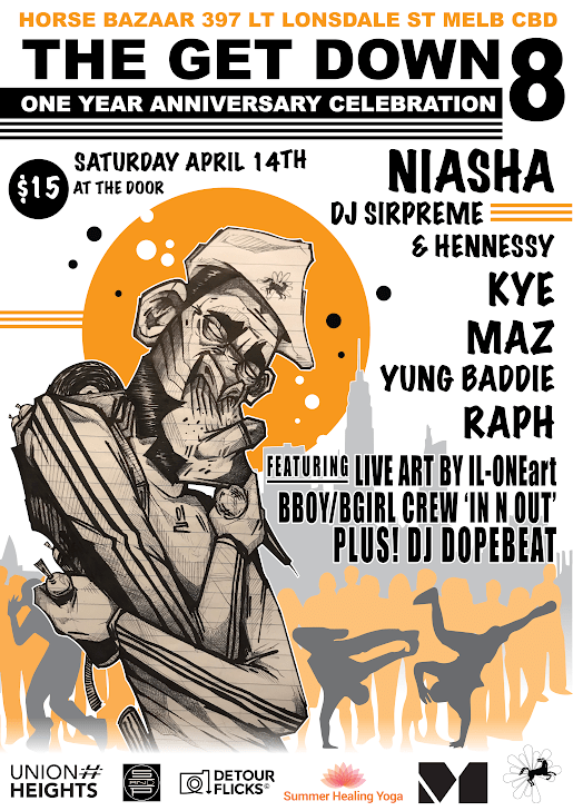 Bringing all the elements together for this special occasion, whilst showcasing another 6 incredibly talented Hip-hop, Rap, Soul, RnB acts. Included, Il_One will be creating the dopeness with his LIVE ART, local Bboy/Bgirl crew “In N Out” will be jammin’ on the dance floor in between the acts to the beats that DJ Dopebeat and DJ Sirpreme throw down on the wheels of steel. All this and more at The Get Down #8.
