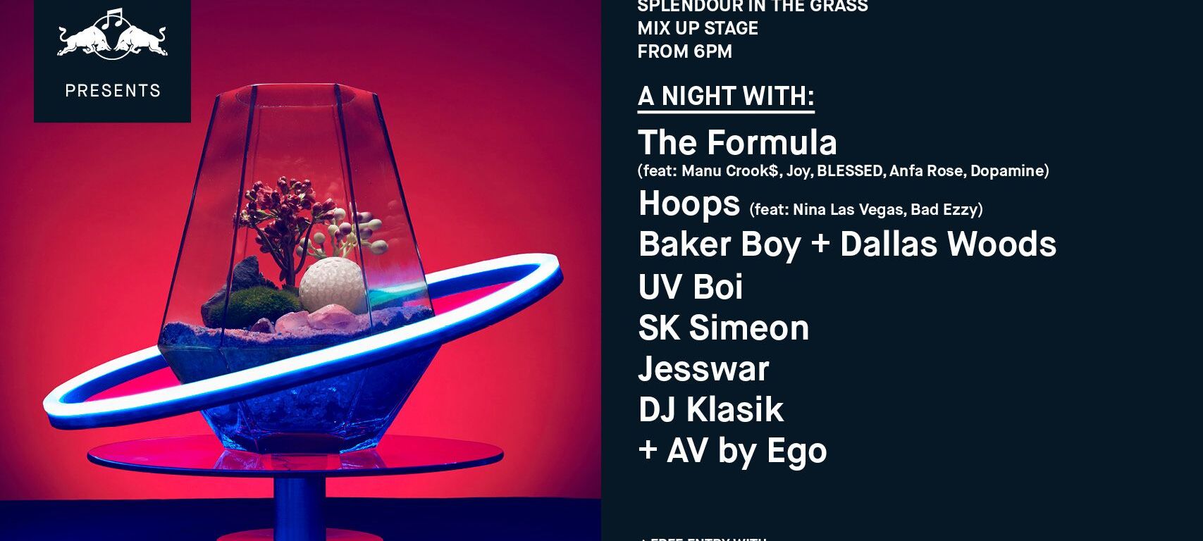 From Splendour’s Mix Up Stage, Red Bull Music will provide a monumental kick off to the sold-out, three day festival, seeing early punters catch performances from some of the best musical acts in Australia. Witness the live debut of hip-hop & RnB collective The Formula (Manu Crook$, Joy, Anfa Rose, BLESSED and Dopamine), North East Arnhem Land’s Baker Boy with collaborator Dallas Woods, Sydney-via-Uganda’s SK Simeon, DJ outfit Hoops in a special superclub format, Brisbane producer UV boi فوق بنفسجي, fearless 22-year-old Jesswar, and favoured selector DJ Klasik. Serving up the visual component of the evening is talented audio visual artist, Ego. Having worked across some of Australia’s largest festivals, his surreal compositions will light up the Mix Up Stage and set the scene for Red Bull Music Presents: A Night With.