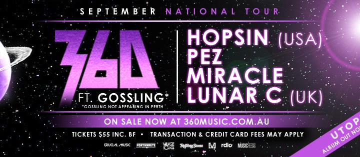 Landing In Queensland, New South Wales, Victoria And Western Australia This January 2015 Tickets on Sale Friday November 14 from 360music.com.au Crucial Music and Village Sounds are proud to announce 360, the country’s hottest and most controversial rapper is taking his stellar LP Utopia out to the elements of regional Australia on a 16-date tour across four weeks this January. The Utopia Regional Tour kicks off on Queensland’s Sunshine Coast, heading down the New South Wales coast, in through country and coastal Victoria, before heading across to Western Australia. With recent headlines proving that he’s often imitated but never replicated, … Continue reading 360 Announces The Utopia Regional Tour Tickets On Sale Friday
